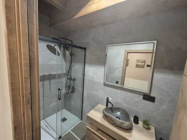La casa de divide en dos plantas, es un alojamiento tipo dúplex. En la plata baja se encentra la cocina y el salón-comedor con chimenea. En la segunda planta encontrarás las habitaciones y un baño completo con columna de ducha.